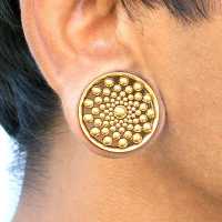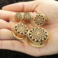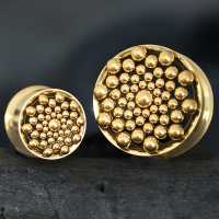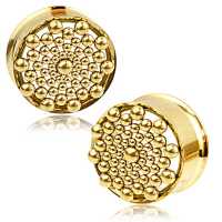 A very intricate hand welded and PVD gold coated steel ear-tunnel crafted by our masterful steel jewelry artisans using our steel cluster piercing welding system. This steel flesh tunnel is available from small to large gauge piercing size. We welcome to browse for more steel piercing jewelry in our huge steel body jewelry wholesale collection.