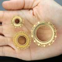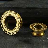 This is a handmade PVG gold coated steel ear tunnel with small steel stars and rings welded to make a extraordinary steel flesh tunnel design. With a convenient screw system this steel body jewelry is very easy to wear and make for a comfortable fit.