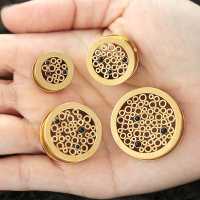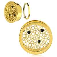 A futuristic PVG gold coated steel ear tunnel that have been created by welding tiny little steel tubes together by hand and adding a few black onyx cabochons. These steel flesh tunnels are available in many sizes and colors in our steel body jewelry wholesale section.