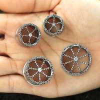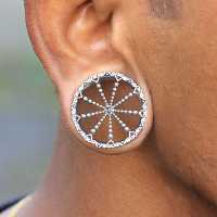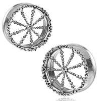 Our famous filigree steel flesh tunnel is created from small steel hearts and balls welded to a steel ear-tunnel by hand. Our finishing touch to this steel body jewelry is that in the centre of the steel piercing jewelry we set a clear zirconia crystal.