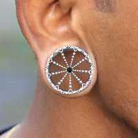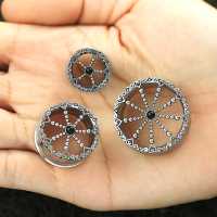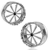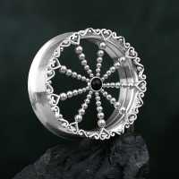 This filigree steel flesh tunnel is created from small steel hearts and balls welded to a steel ear-tunnel by hand. Our finishing touch to this steel body jewelry is that in the centre of the steel piercing jewelry we set a black onyx cabochon.
