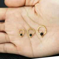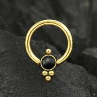 This PVD gold coated BCR piercing has been hand welded by our steel jewelry smiths using our innovative steel cluster piercing method. Set with a black onyx cabochon this will make for a great addition to the ear as a conch piercing, snug piercing or as a daith piercing.