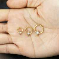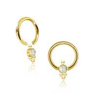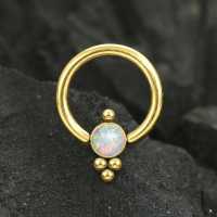 This PVD gold coated captive bead piercing has been hand-made by our steel jewelry smiths using our innovative steel cluster piercing method. Set with a synthetic white opal will make this a comfy fit in the ear as a conch piercing, snug piercing or as a helix piercing.