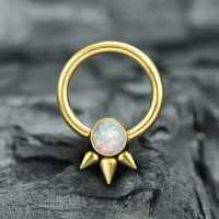 Here is an example of what style of steel body jewelry you can stumble across while browsing our huge wholesale steel piercing jewelry assortment. This is a PVD gold plated captive bead ring set with a synthetic white opal and is suitable for ear piercing, nose piercing as well as eyebrow piercing.
