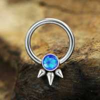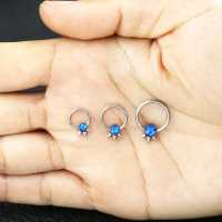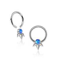 A punk jewelry inspired steel piercing BCR that has been welded by hand using our steel cluster piercing method and then finished off with a synthetic blue opal. Gives a sassy look in the ear as a conch piercing or as a helix piercing. Also great to wear as a septum piercing or eyebrow piercing.