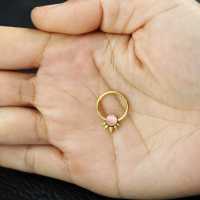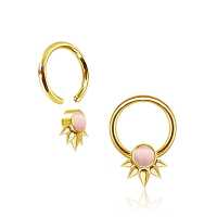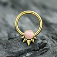 Hand-welded using steel piercing balls and spikes we have created this bohemian body jewelry design. PVD coated then set with a rose colored cat eye cabochon this is one of many color options in our wholesale steel piercing jewelry collection for this captive bead piercing.