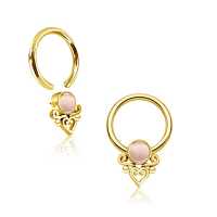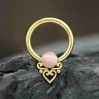 Hand-welded using tiny steel piercing parts we have fabricated this bohemian body jewelry design. PVD gold coated then set with a rose colored cat eye cabochon this is one of many color options in our wholesale steel piercing jewelry collection for this captive bead piercing.
