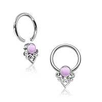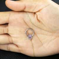 A spiky BCR piercing that has been hand welded by our steel jewelry artisans using our steel cluster piercing procedure. Set with a purple cat eye cabochon this is a ideal captive bead ring to be used as a nose piercing, eyebrow piercing or ear piercing.