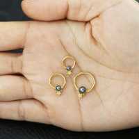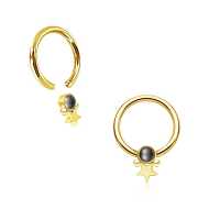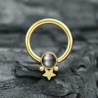 This PVD gold coated captive bead piercing has been crafted by hand using a cutting edge steel cluster piercing process and then set with a synthetic black pearl. Great to wear in the ear as a rook piercing, helix piercing or tragus piercing to mention a few options.