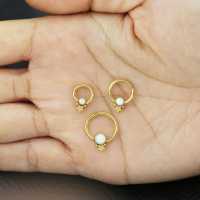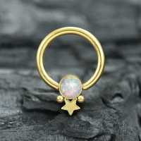 A star designed captive bead piercing, PVD gold coated and set with a synthetic white opal. A simple yet very elegant steel BCR design that has several wearing options in the ear such as helix piercing, daith piercing and rook piercing.