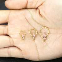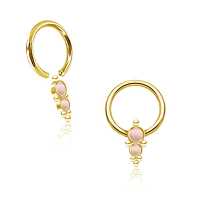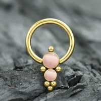 Here we offer a high class PVD gold coated steel BCR piercing with two rose colored cat eye cabochons merged with tiny steel piercing balls. This and many more stylish captive bead rings are readily available in our wholesale steel piercing collection.