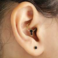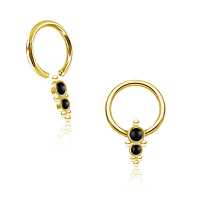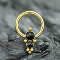 Yet another sophisticated captive bead ring made up of tiny steel piercing balls and a couple of black onyx cabochons carefully welded together. These high class PVD gold plated steel BCR piercings are great to be worn as lip piercing, septum piercing or in the ear as daith piercing or rook piercing