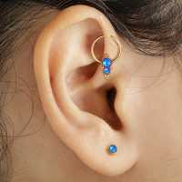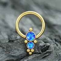 A fancy captive bead ring made up of several steel piercing balls and a couple of synthetic blue opal cabochons methodically welded together by hand. We offer these high class PVD gold plated steel BCR piercings at wholesale body piercing prices in our online body jewelry store.