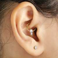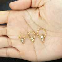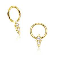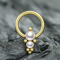 This captive bead ring made up of several steel piercing balls and a couple of synthetic white pearl cabochons methodically welded together by hand. These high class PVD gold plated steel BCR piercings are great to be worn as lip piercing, septum piercing or in the ear as daith piercing or rook piercing.