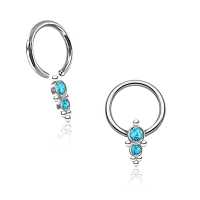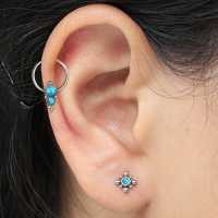 Yet another stylish captive bead ring created of tiny steel piercing balls and a couple of synthetic turquoise cabochons expertly welded together. These high end surgical steel BCR piercings are great to be worn as lip piercing, septum piercing or in the ear as daith piercing or rook piercing.
