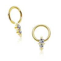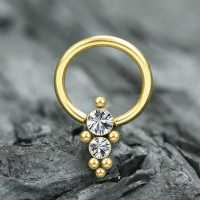 A fancy PVD gold plated crystal BCR piercing with two zirconia crystals accented with multiple steel piercing balls. This piece of steel body jewelry have been patiently welded together piece by piece to perfection in our own steel jewelry workshop.