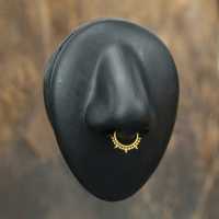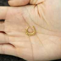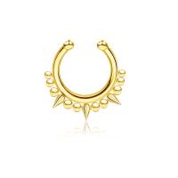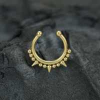 A punk jewelry inspired septum jewelry design decorated with a couple of steel spikes and steel piercing balls. The PVD gold plating finish makes for a very high quality septum steel piercing that will satisfy any steel body jewelry enthusiast.