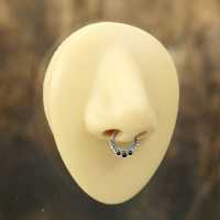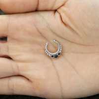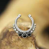 All our steel septum rings are handmade using hypo allergenic 316L steel. To keep our steel body jewelry quality guaranteed we produce most of our collections in house by our steel piercing jewelry smiths. Here is a perfect septum piercing jewelry set with three synthetic black onyx cabochons.
