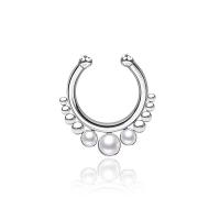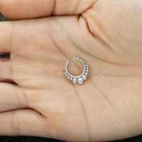 All our steel septum rings are handmade using hypo allergenic 316L steel. To keep our steel body jewelry quality guaranteed we manufacture almost all of our steel septum jewelry in house by our steel piercing jewelry smiths. Here is a classic looking septum piercing jewelry set with three synthetic white pearls.