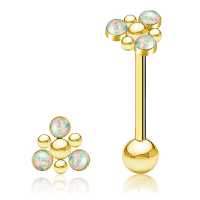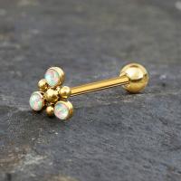 A triangular shaped steel piercing tongue bar PVD plated and set with three synthetic white opal cabochons. We offer this tongue piercing jewelry in several colors and stone options in our wholesale body piercing web-shop at very affordable prices.