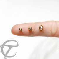 A gold coloured implant grade titanium ball with a clear crystal set on the side makes this Threadless piercing end. Match it up with curved or straight Threadless piercing bars to create a stunning Threadless Eyebrow piercing or Threadless Rook piercing.