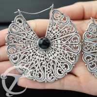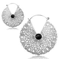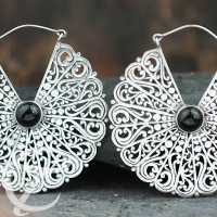 Here is a stunning filigree designed white brass earring decorated with black onyx stone cabochons. We proudly offer these tribal earrings in other stones in our wholesale white brass jewelry collection as well as brass earrings in our brass jewelry section.