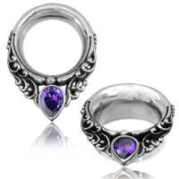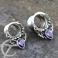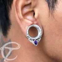 This white brass ear tunnel with a set synthetic Amethyst stone has the feel of tribal white brass jewelry and is perfect for medium to large gauge piercing.